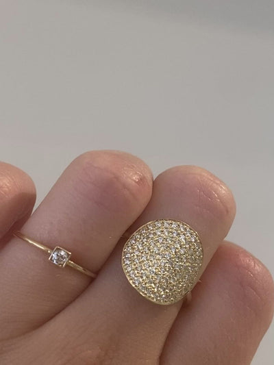Our 14-karat gold curved pave diamond disk ring with Approx. 65ct of shimmering white pave diamonds is a perfect statement piece that can be worn day and night.
