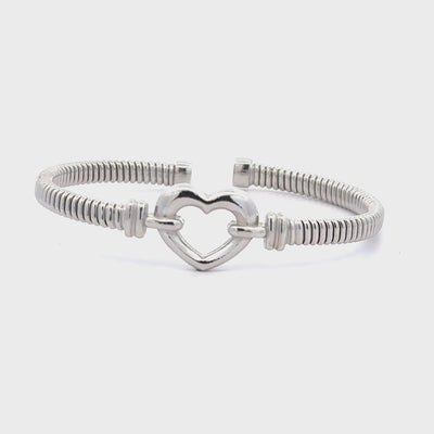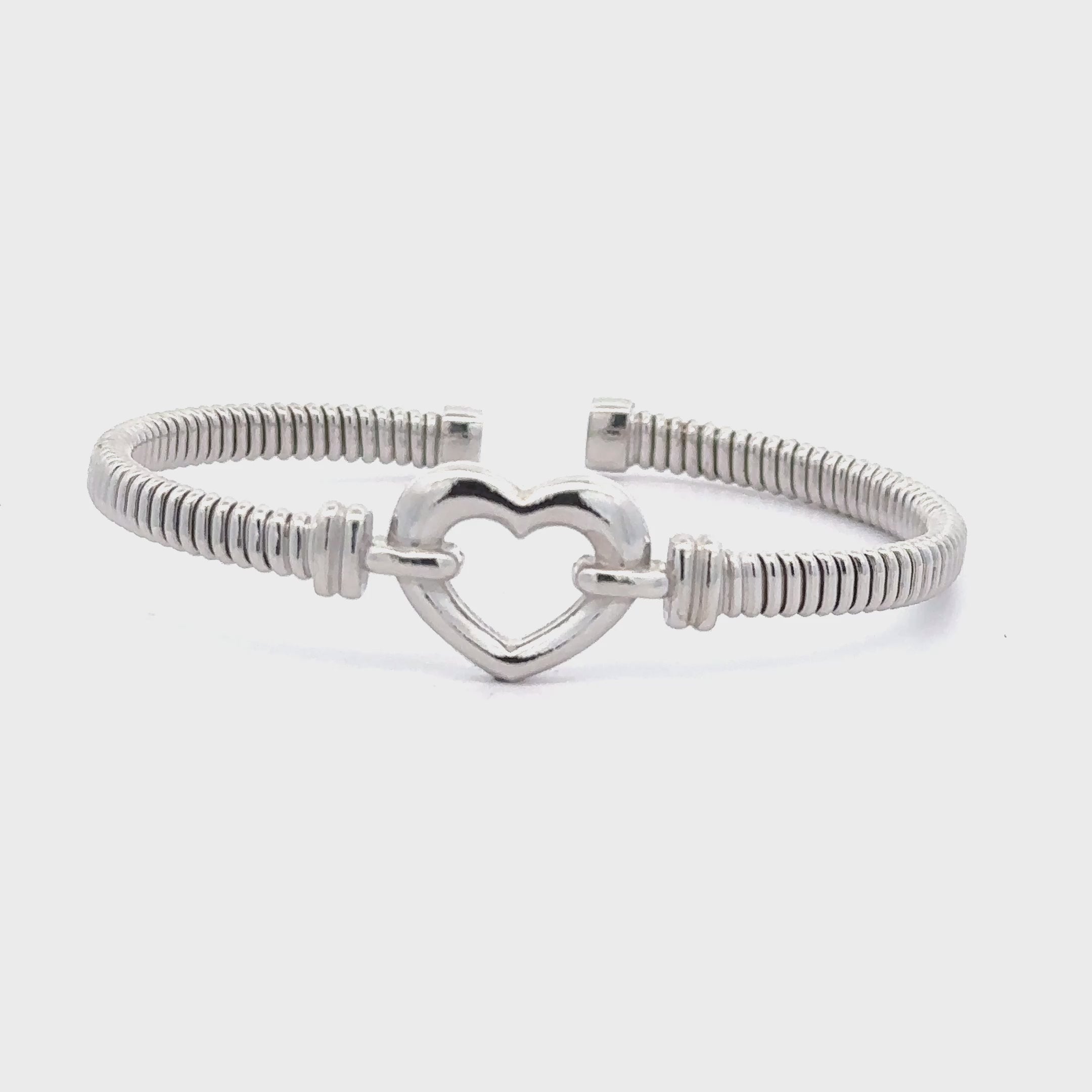 Adorn your wrist with this captivating sterling silver cuff. Crafted in sleek sterling silver, its unique spring form gently hugs the wrist. A polished heart motif serves as the focal point, offering a contemporary expression of love and style. This cuff seamlessly blends classic elegance with modern design, making it an ideal piece for everyday wear or special occasions.