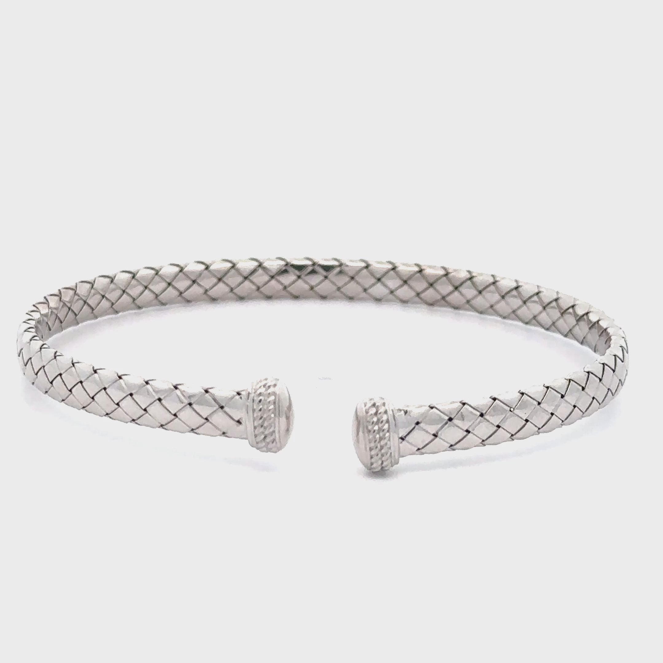 Elevate your style with this exquisitely crafted basketweave italian cuff bracelet. Composed of lustrous sterling silver, this cuff boasts a unique woven design, culminating in elegant end caps. The composition, design, and attention to detail converge to create a timeless piece of wearable art.