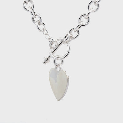 Elevate your style with this chic sterling silver oval link chain necklace. Featuring a heart pendant and toggle closure, this piece offers a touch of modern elegance and classic design. The polished silver adds a lustrous shine, making it a perfect accessory for any occasion. It is designed to add a touch of sophistication to your everyday look.