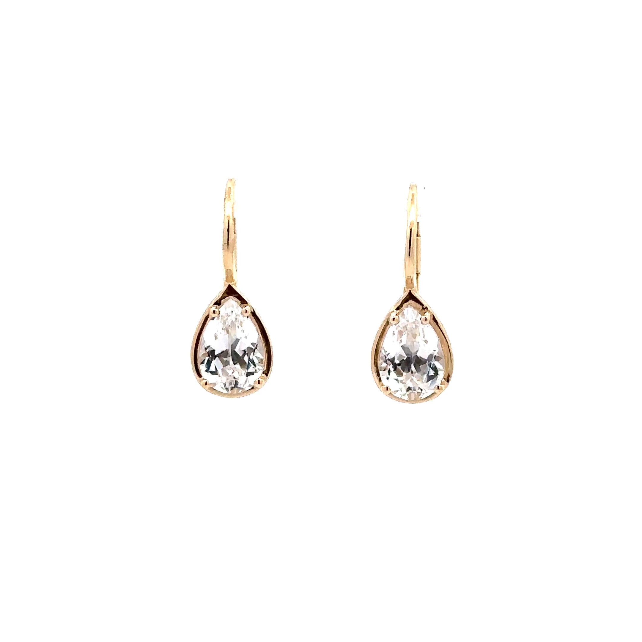 Elevate your style with these exquisite 14 karat gold pear-shaped white topaz earrings. Crafted with precision and elegance, these earrings exude timeless sophistication. The pear-shaped white topaz stones shimmer and sparkle with every movement, adding a touch of glamour to any outfit.