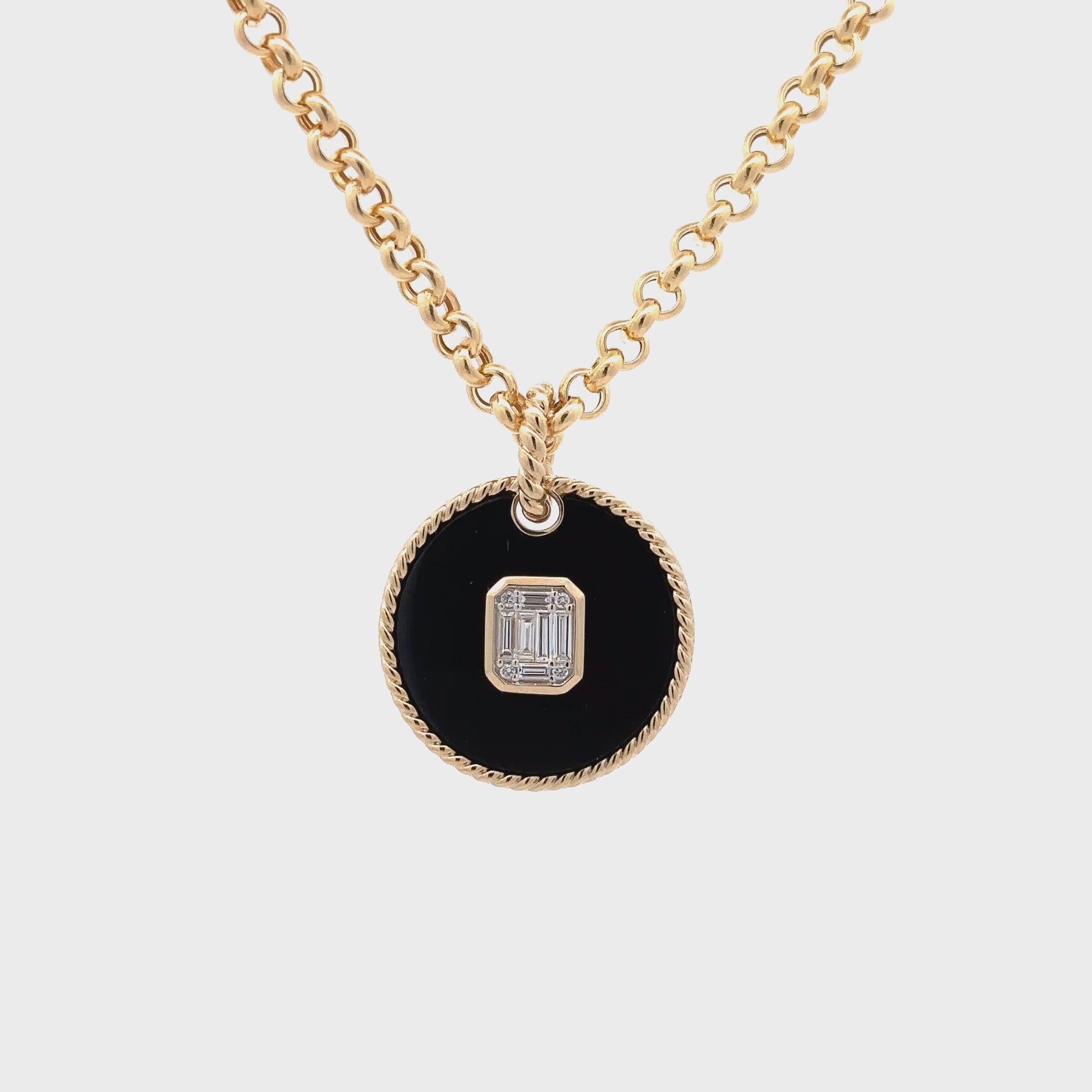 WD1251 14kt Gold Black Onyx Coin with Baguette Emerald Cut Diamond Necklace