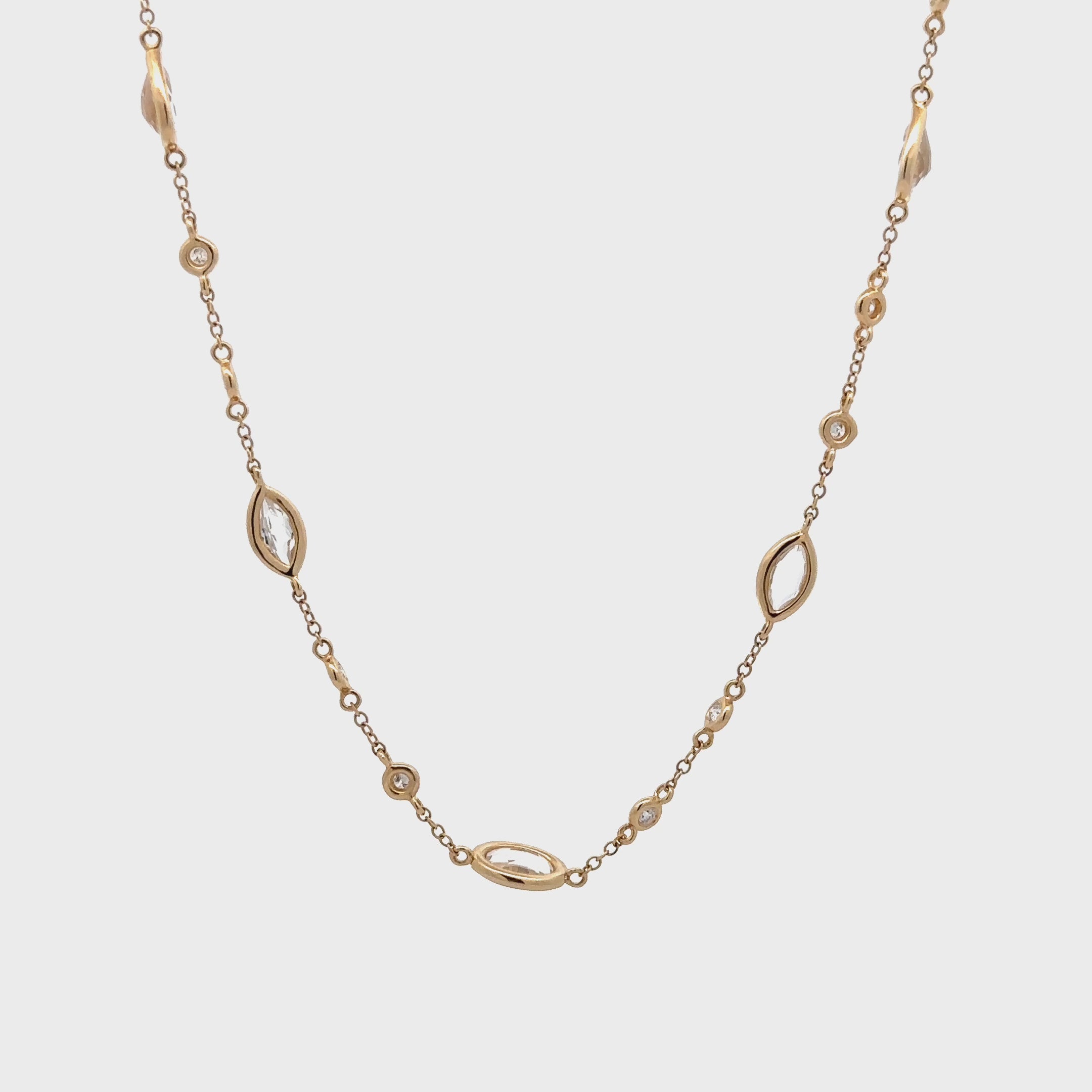 Introducing our exquisite 14 karat white topaz and diamond necklace, a true embodiment of elegance and sophistication.