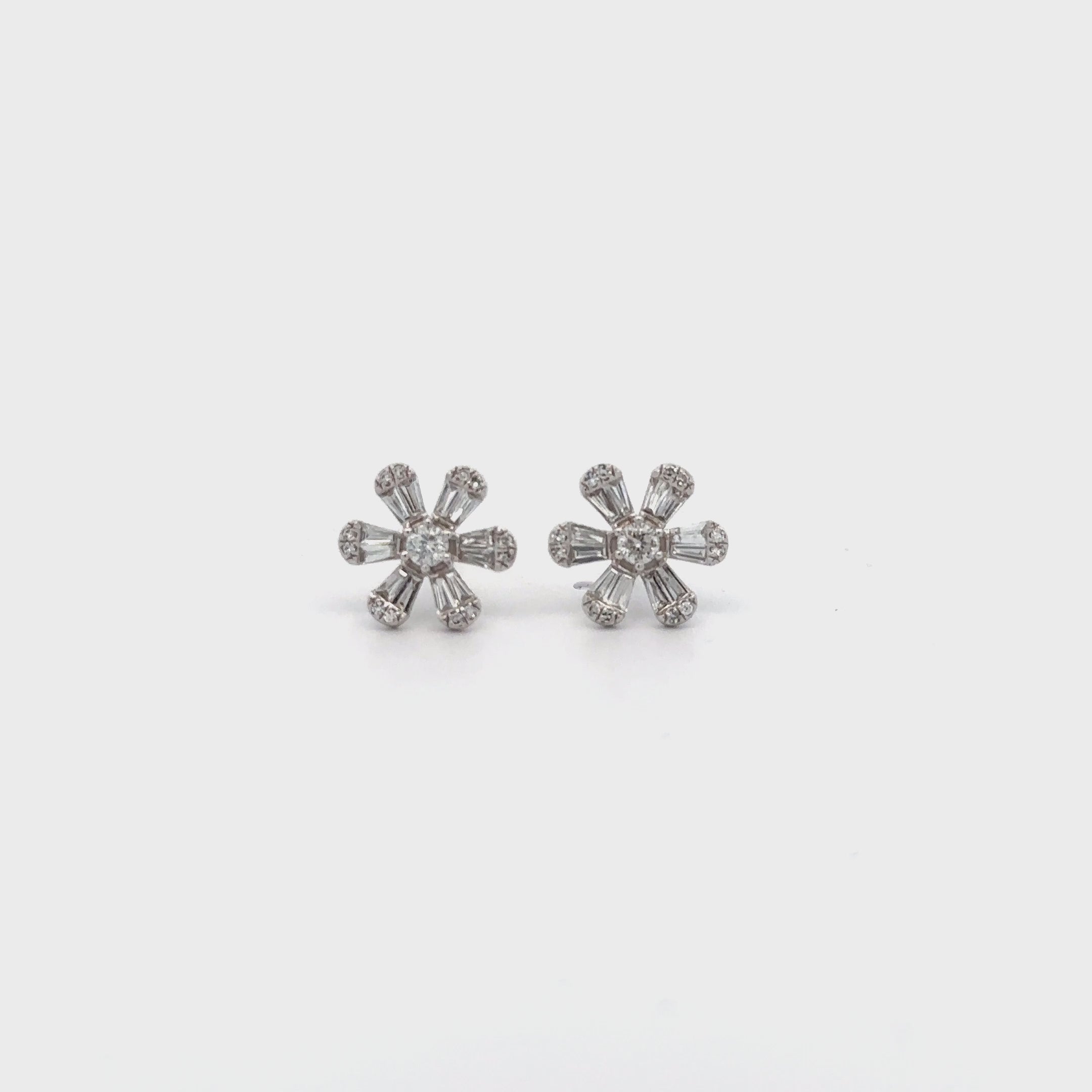 Introducing our exquisite 14 karat gold six petal flower diamond earrings, the epitome of elegance and sophistication. Crafted with meticulous attention to detail, these stunning earrings will effortlessly enhance your natural beauty. Adorned with a mesmerizing combination of round and baguette diamonds, these earrings sparkle and shimmer from every angle.