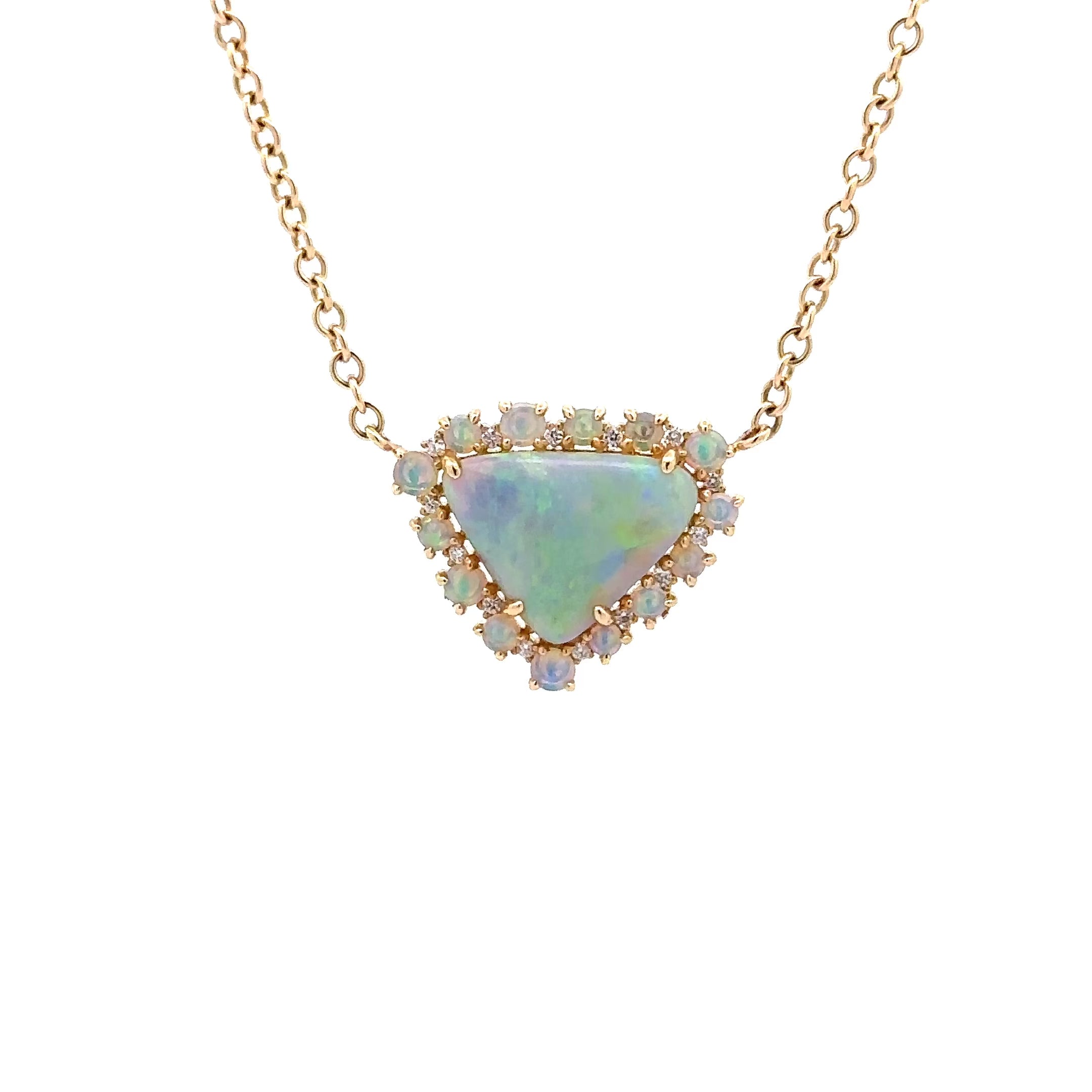 Elevate your style with this exquisite 14 karat gold opal necklace featuring a stunning opal center stone surrounded by a dazzling diamond halo. The luminous opal shimmers with iridescent colors, while the brilliant diamonds add a touch of elegance and sophistication.