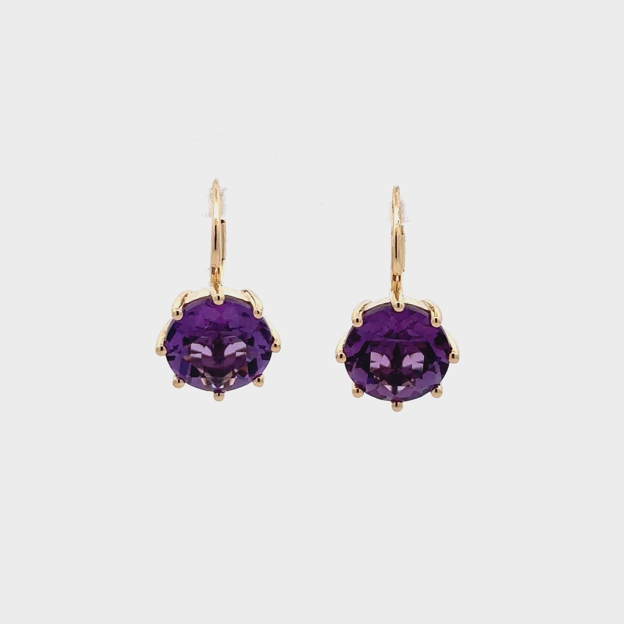 Enhance your elegance with these stunning 14 carat round cut purple amethyst earrings. The simple yet elegant design features eight prong-set stones that delicately dangle from your ears, creating a captivating and sophisticated look. Add a touch of glamour to any outfit with these exquisite earrings that are sure to leave people speechless.