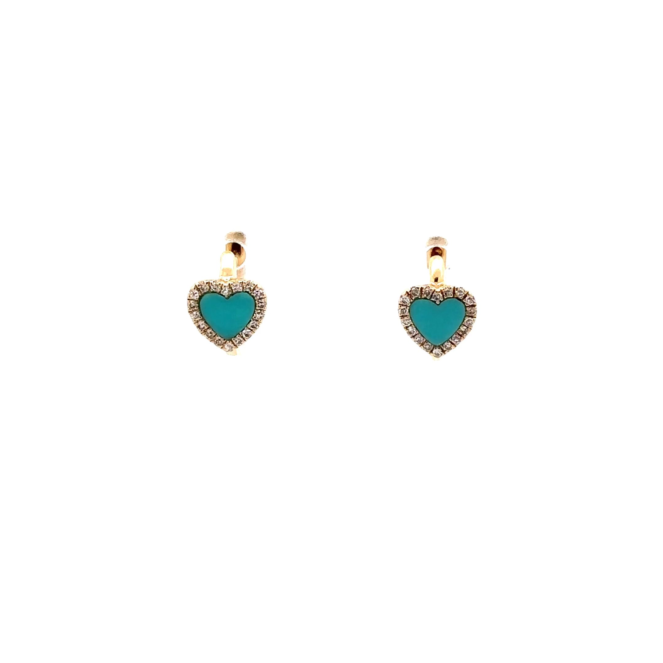 WD1343 14KT Gold Turquoise Inlay Heart with Diamond Halo Huggie Hoops