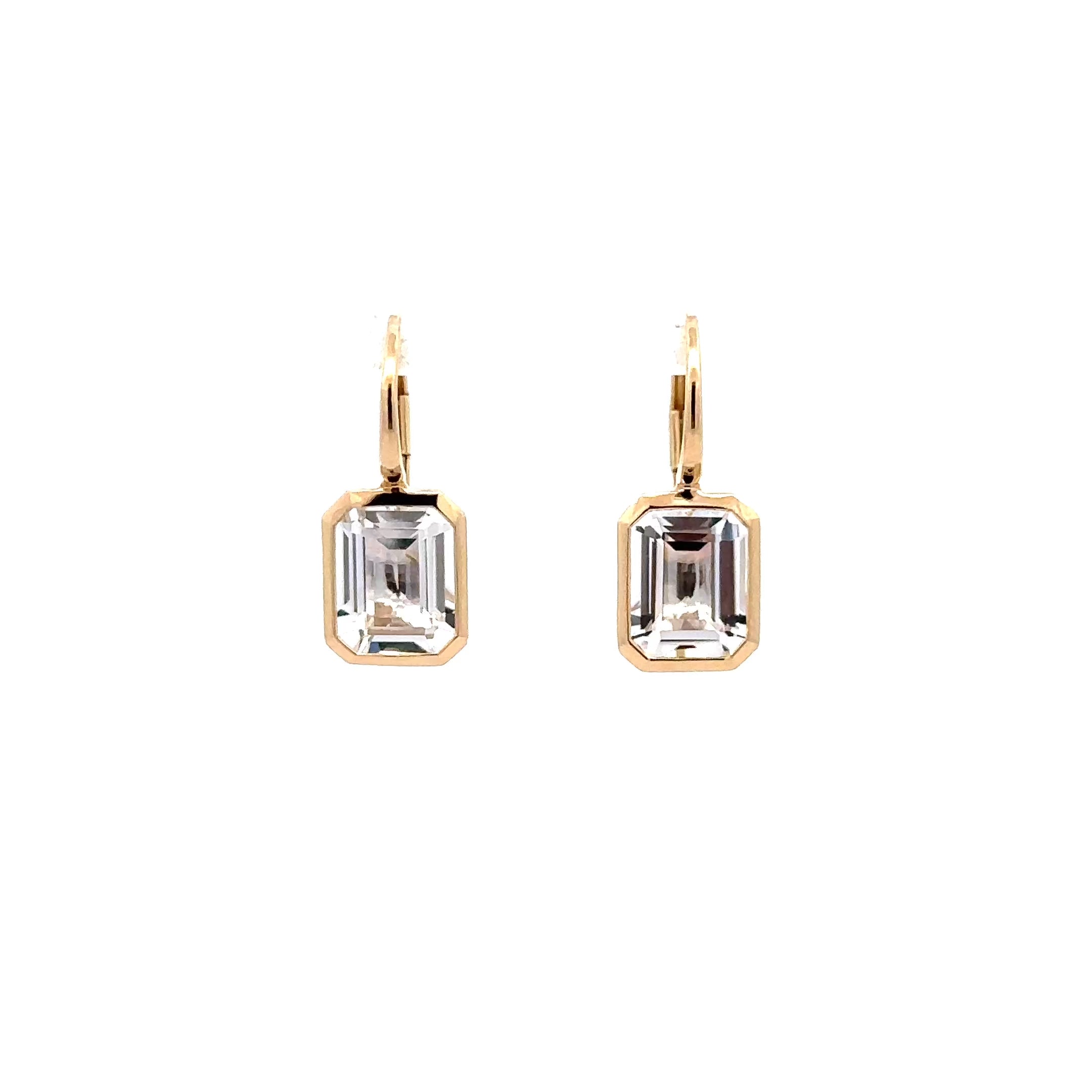Elevate your style with these exquisite 14 karat gold emerald-shaped White Topaz earrings. Crafted with precision and elegance, these earrings exude timeless sophistication. The emerald-shaped White Topaz stones shimmer and sparkle with every movement, adding a touch of glamour to any outfit.