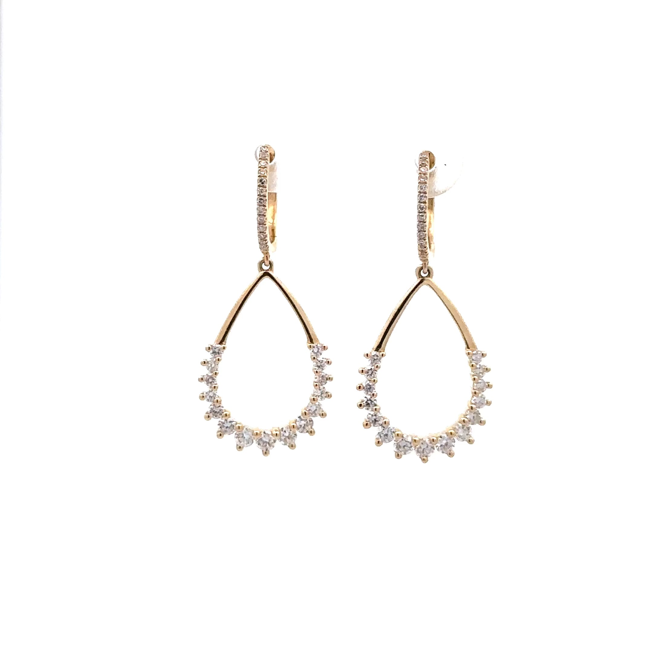 Elevate your look with these exquisite 14 karat yellow gold pear-shaped diamond drop earrings. The stunning pear-shaped diamonds glisten and sparkle with every movement, catching the light effortlessly. The sleek and elegant design adds a touch of sophistication to any outfit, making them a must-have accessory for any jewelry lover.