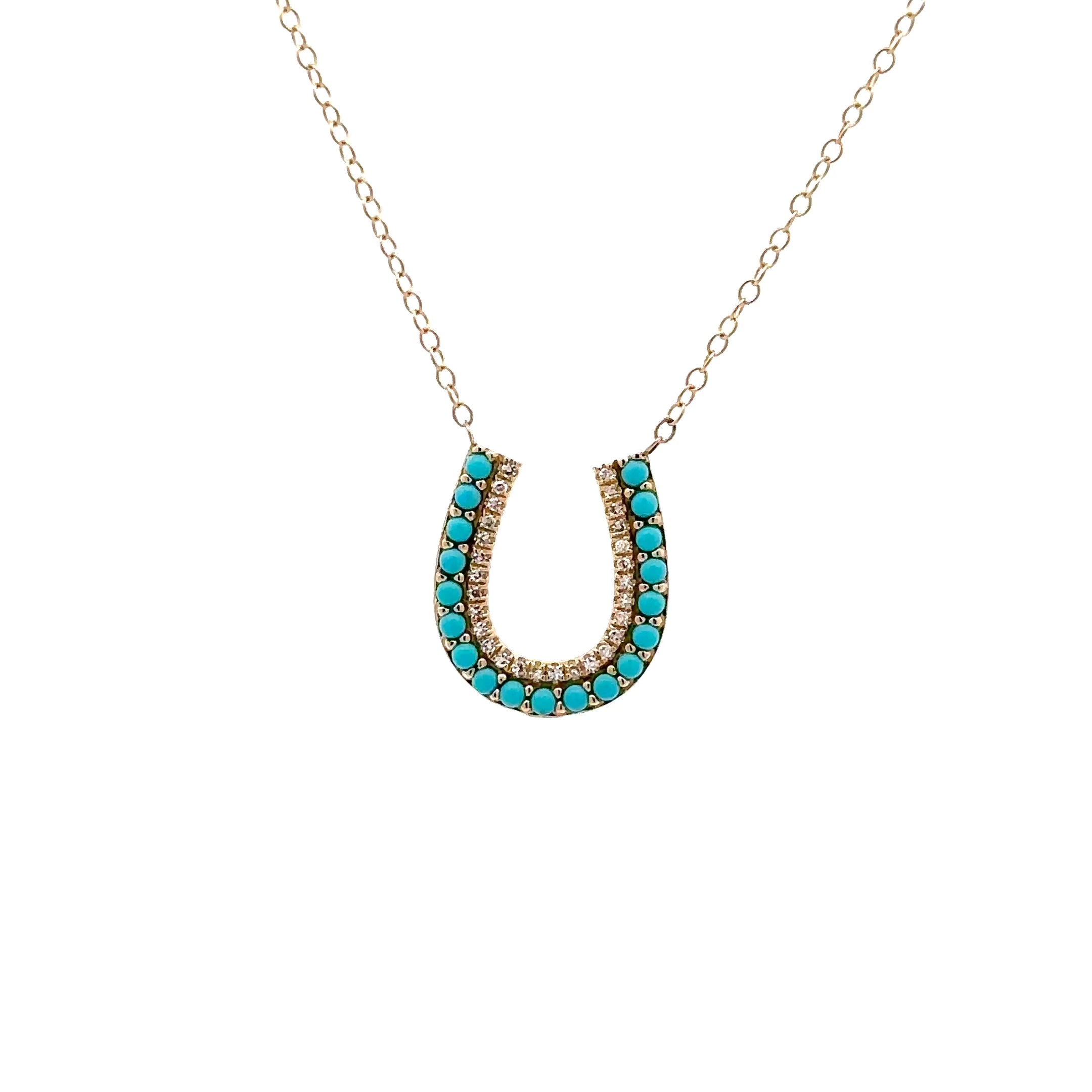 Elevate your style with this stunning 14 karat gold, turquoise and diamond horseshoe necklace. Crafted with precision and attention to detail, this exquisite piece features a horseshoe pendant adorned with vibrant turquoise stones and shimmering diamonds. The combination of the rich gold, striking turquoise, and brilliant diamonds creates a truly mesmerizing look.