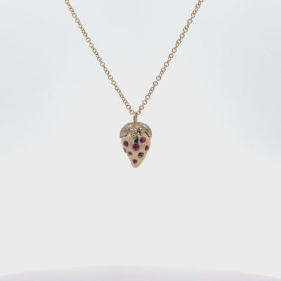 This exquisite strawberry pendant necklace is a charming addition to any jewelry collection. The delicate gold chain perfectly complements the intricately designed strawberry charm, adorned with rubys and diamonds that catch the light beautifully. Ideal for both casual and formal occasions, this piece adds a touch of whimsy and elegance to your look.
