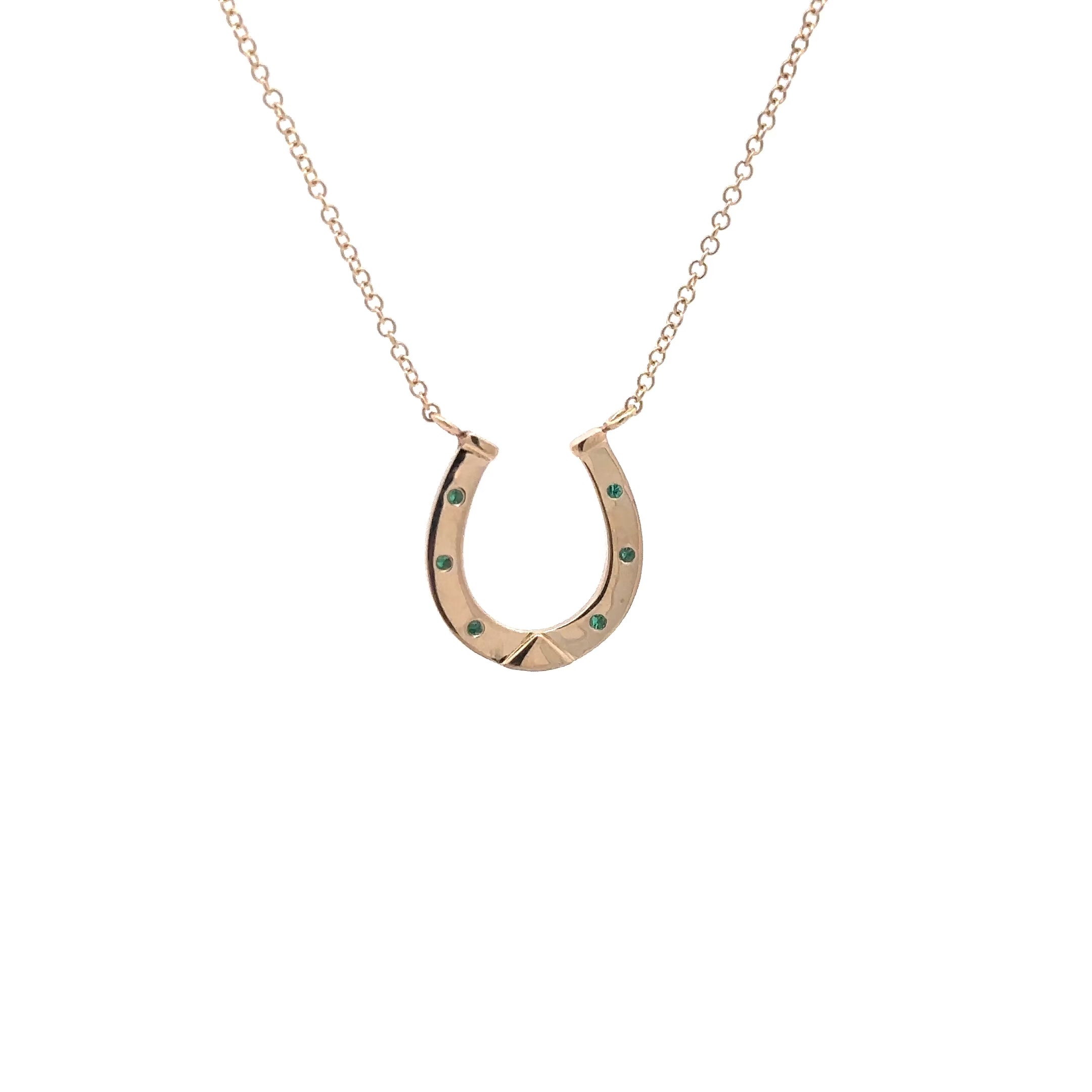 Elevate your style with this stunning 14kt gold horseshoe necklace adorned with sparkling emeralds. The intricate design of the horseshoe symbolizes good luck and protection, making it the perfect accessory for any occasion.