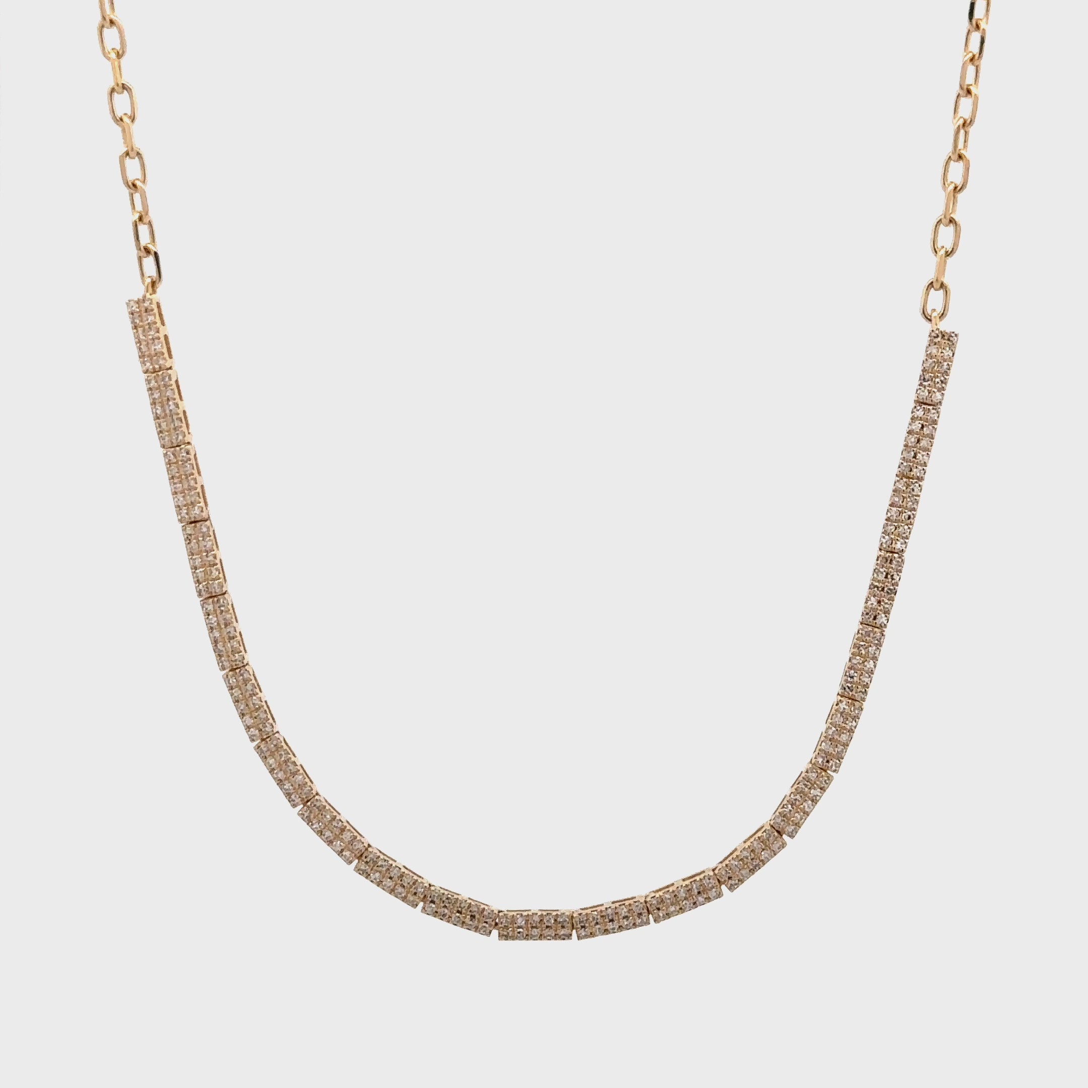 This exquisite 14kt gold necklace features a delicate chain adorned with a series of sparkling diamonds. Each diamond is meticulously set to catch the light, adding a touch of elegance and sophistication to any outfit. Perfect for both everyday wear and special occasions, this necklace is a timeless addition to any jewelry collection.