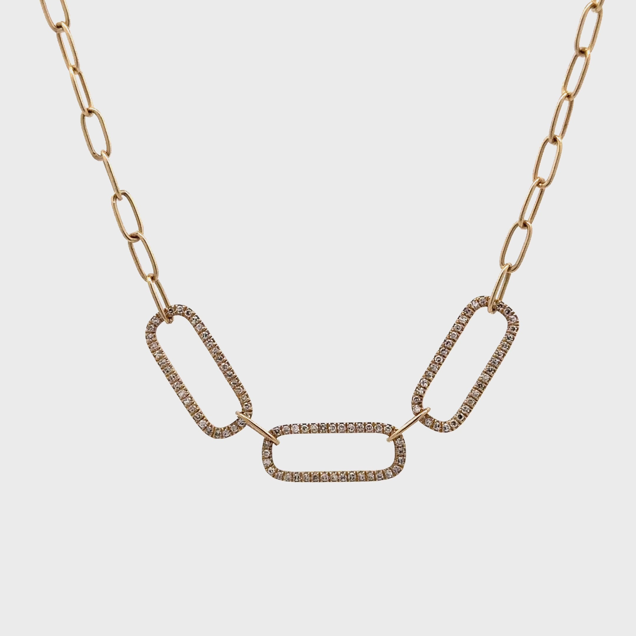 Behold our 14kt Gold Paper Link Necklace with Diamond detail. This piece is designed from high-quality 14kt gold and pave diamonds that boast a luxurious shine that catches the eye from afar.