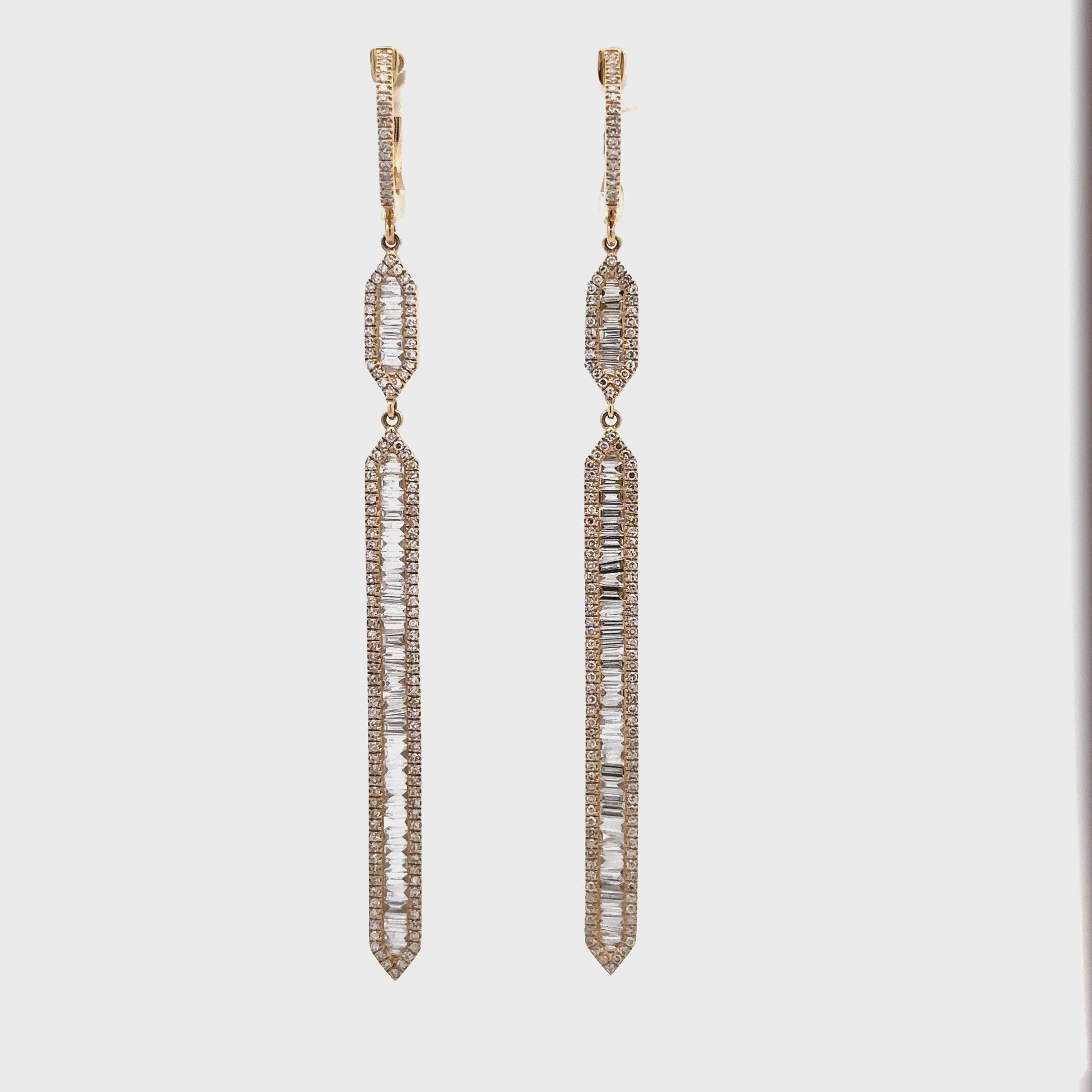These exquisite diamond baguette drop earrings are the epitome of elegance and sophistication. Crafted with precision, they feature a stunning array of sparkling diamonds set in a delicate gold framework. Perfect for special occasions, these earrings add a touch of glamour to any outfit.