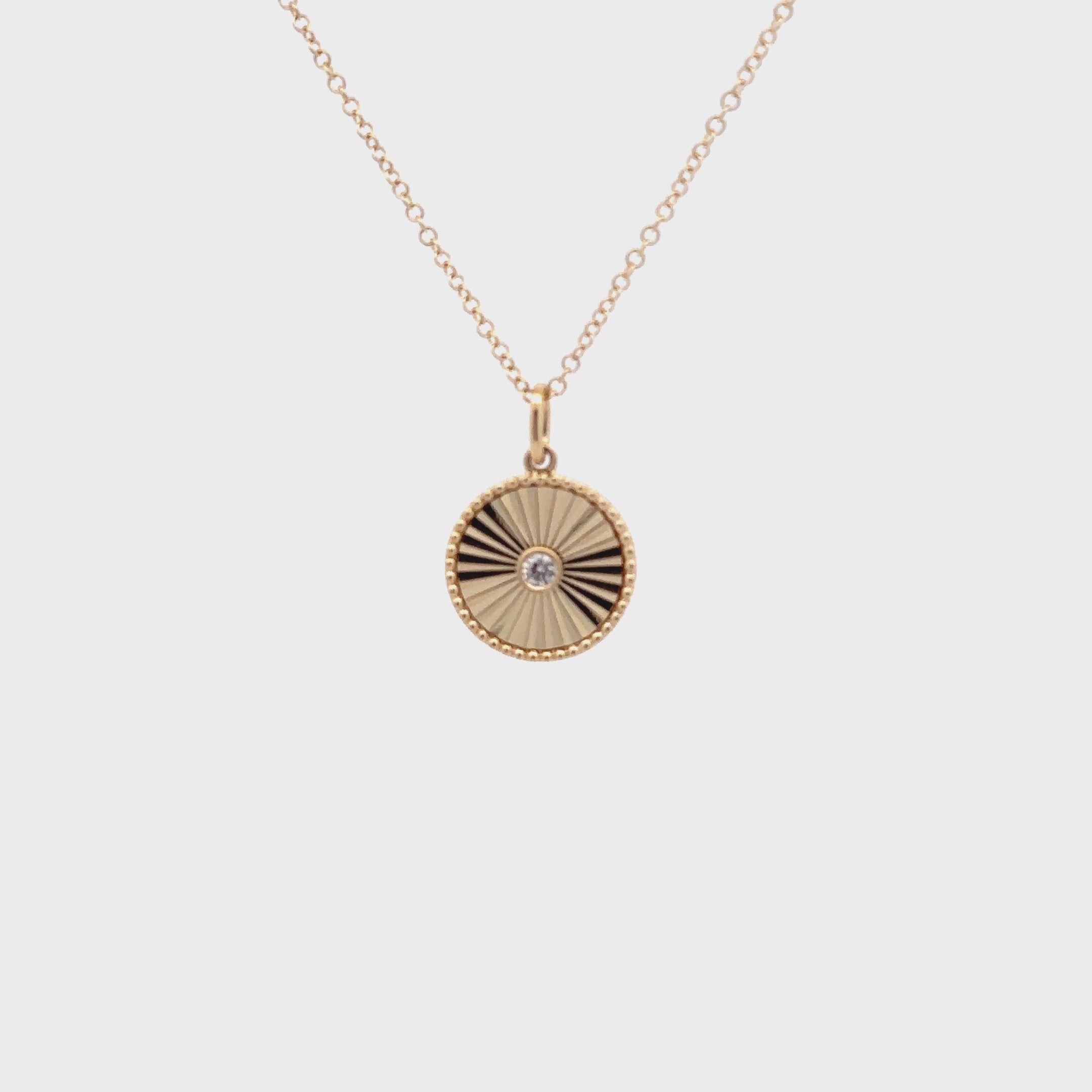 This exquisite gold pendant necklace features a stunning circular design with intricate detailing. At its center, a sparkling diamond detail that catches the light, adding a touch of elegance and sophistication. Perfect for any occasion, this necklace is a timeless piece that complements any outfit.