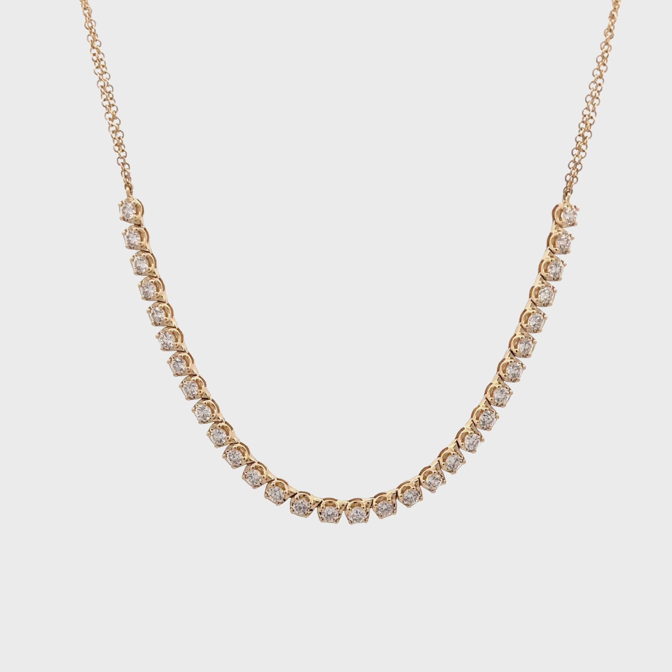 This exquisite 14kt gold shared prong diaond tennis necklace features dazzling diamonds. The elegant chain adds a touch of sophistication, making it the perfect accessory for both formal occasions and everyday elegance.