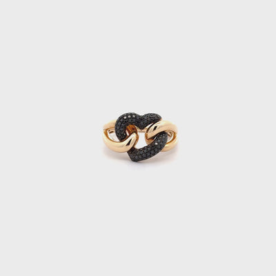 Discover the beauty of this elegant interlocking gold and diamond ring. Crafted with exquisite attention to detail, it features a stunning blend of polished gold and shimmering black diamonds that catch the light beautifully. Perfect for any occasion, this ring adds a touch of sophistication to your jewelry collection.