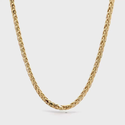 This stunning 14kt gold wehat link chain gold chain exudes elegance and sophistication. Its intricate design and polished finish make it a versatile accessory that can elevate any outfit, whether casual or formal. Perfect for layering or wearing alone.