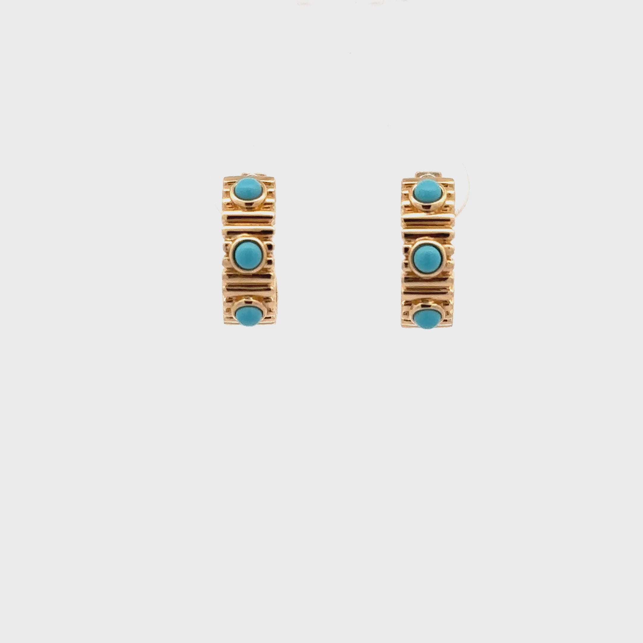These stunning turquoise earrings are the perfect accessory to elevate any outfit. Crafted with a unique design, they feature vibrant turquoise stones set in a chic 14kt gold frame, making them a must-have for any jewelry collection..