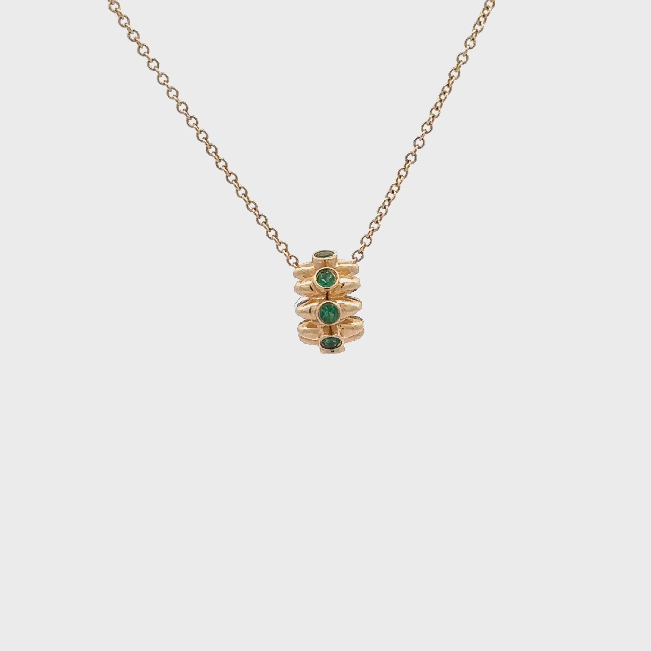Elevate your style with this exquisite 14kt yellow gold Spike Barrel with Emerald Detail.  A refined statement piece with subtle edge. This handcrafted barrel pendant features a faceted design and emeralds, creating the perfect balance of texture and shine. Its unique geometric form makes it ideal for adding to your favorite chain or layering with other charms for a personalized look