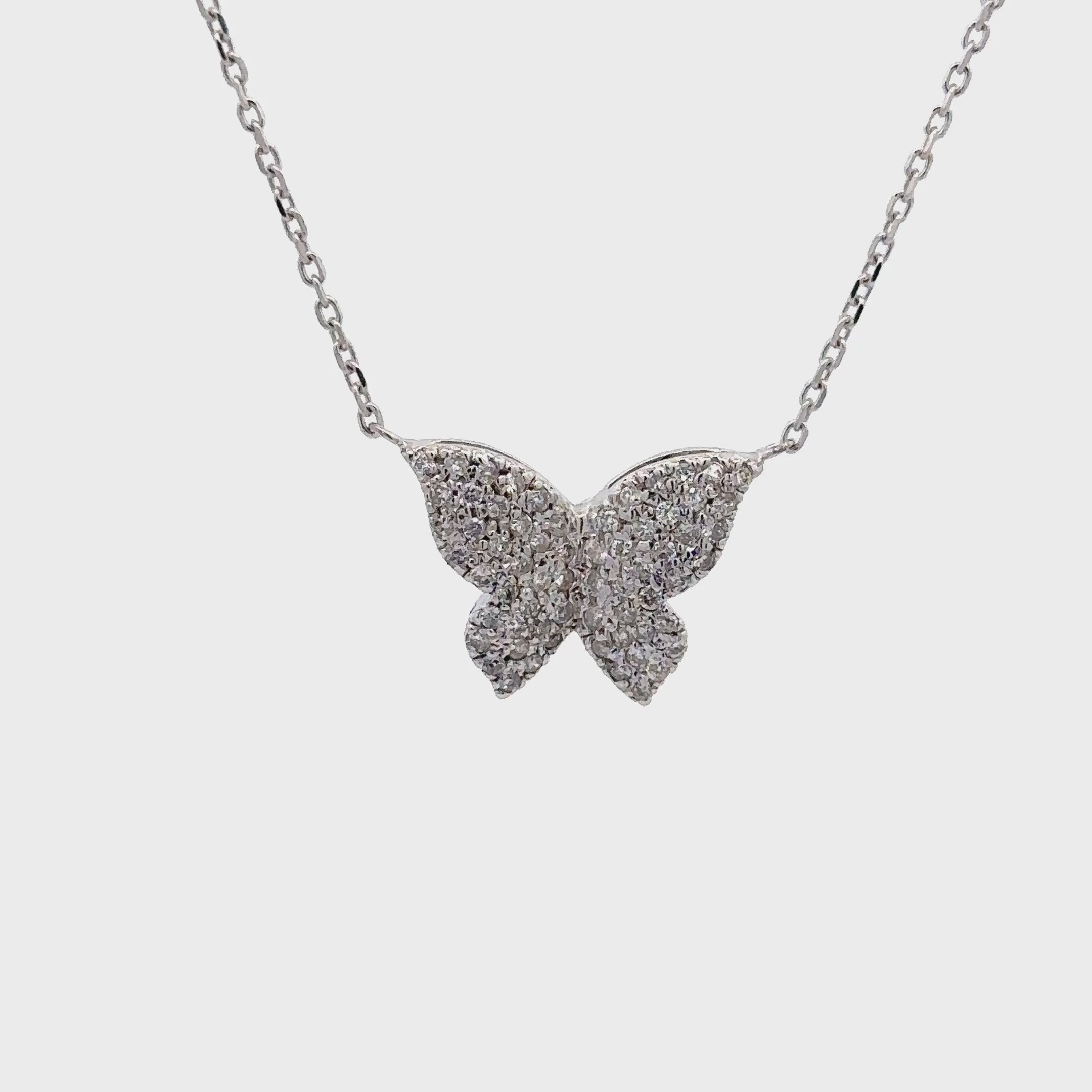 Elevate your style with this exquisite diamond butterfly pendant necklace. Finely crafted in white gold, the necklace features brilliant diamonds set in a pavé style, creating a mesmerizing sparkle. This elegant piece is suspended vertically from a delicate chain.