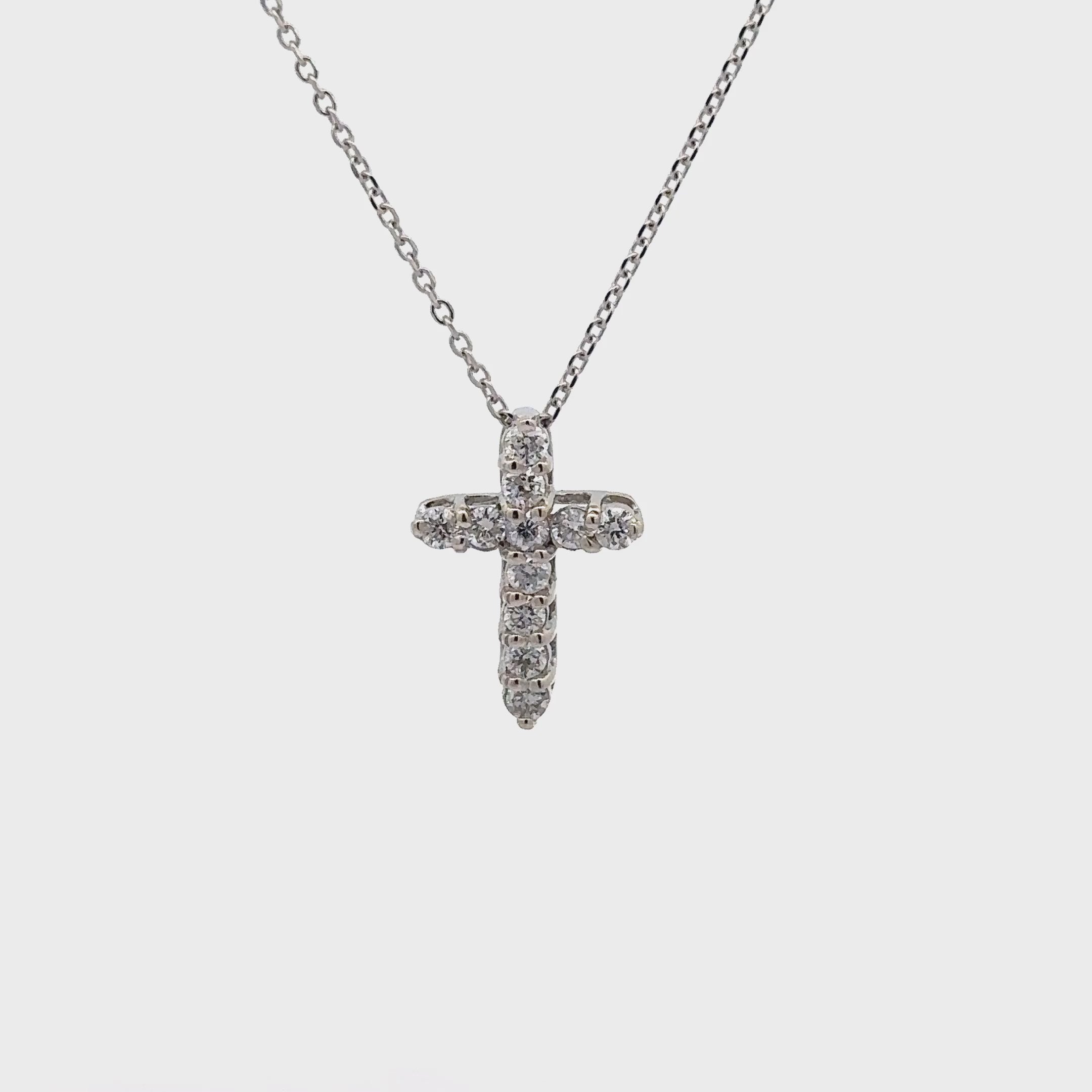 Exquisitely crafted, this necklace features a delicate cross pendant set in white gold. Shared Prong diamonds accentuate the design, exhibiting brilliant sparkle. The meticulous setting and graceful suspension create a refined and elegant piece suitable for everyday wear.