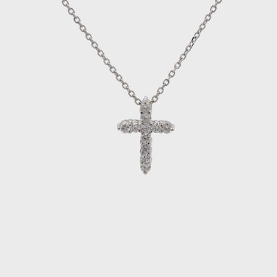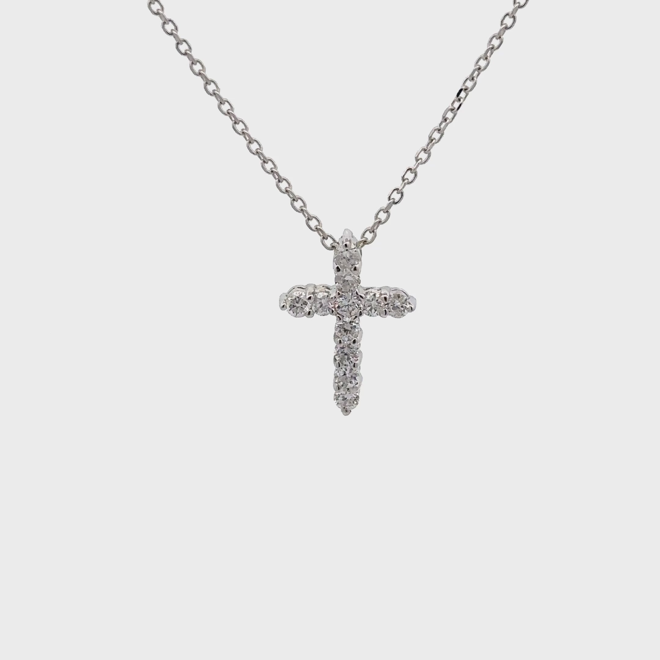 Exquisitely crafted, this necklace features a delicate cross pendant set in white gold. Shared Prong diamonds accentuate the design, exhibiting brilliant sparkle. The meticulous setting and graceful suspension create a refined and elegant piece suitable for everyday wear.