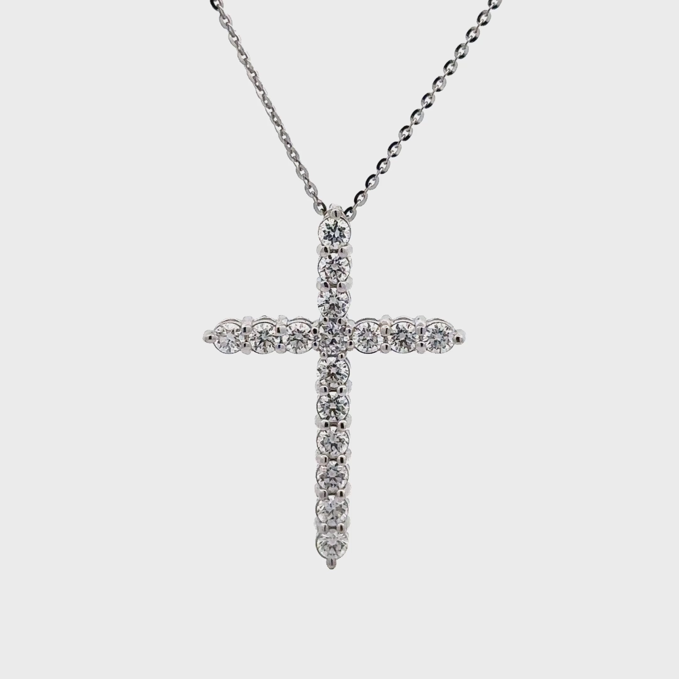 Embrace divine elegance with this stunning diamond cross pendant necklace. Masterfully crafted in white gold over sterling silver, this piece features a series of shared prong brilliant diamonds set in a classic cross design. The impeccable symmetry and polish enhance the natural brilliance of the diamonds, creating a radiant display of faith and fashion.