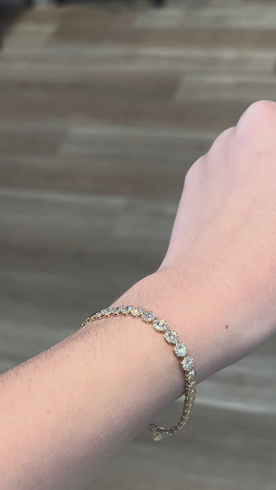 Indulge in the understated luxury of this yellow gold tennis bracelet. Delicately crafted in a warm yellow gold, the design features a continuous strand of meticulously set round brilliant cut diamonds. This elegant bracelet exudes sophistication and timeless appeal, making it a perfect accessory for any occasion.