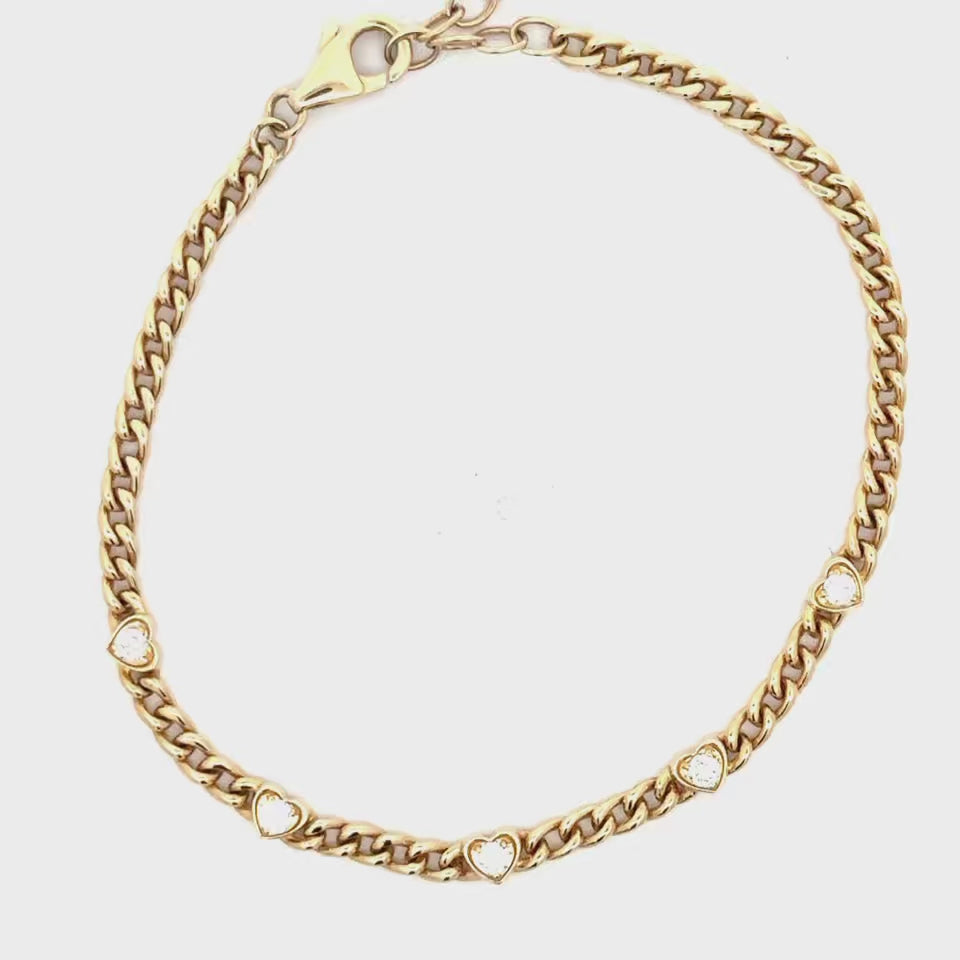 WD1900 14kt Gold Cubin Chain Bracelet with 5 Herat shaped Bezel Diamonds