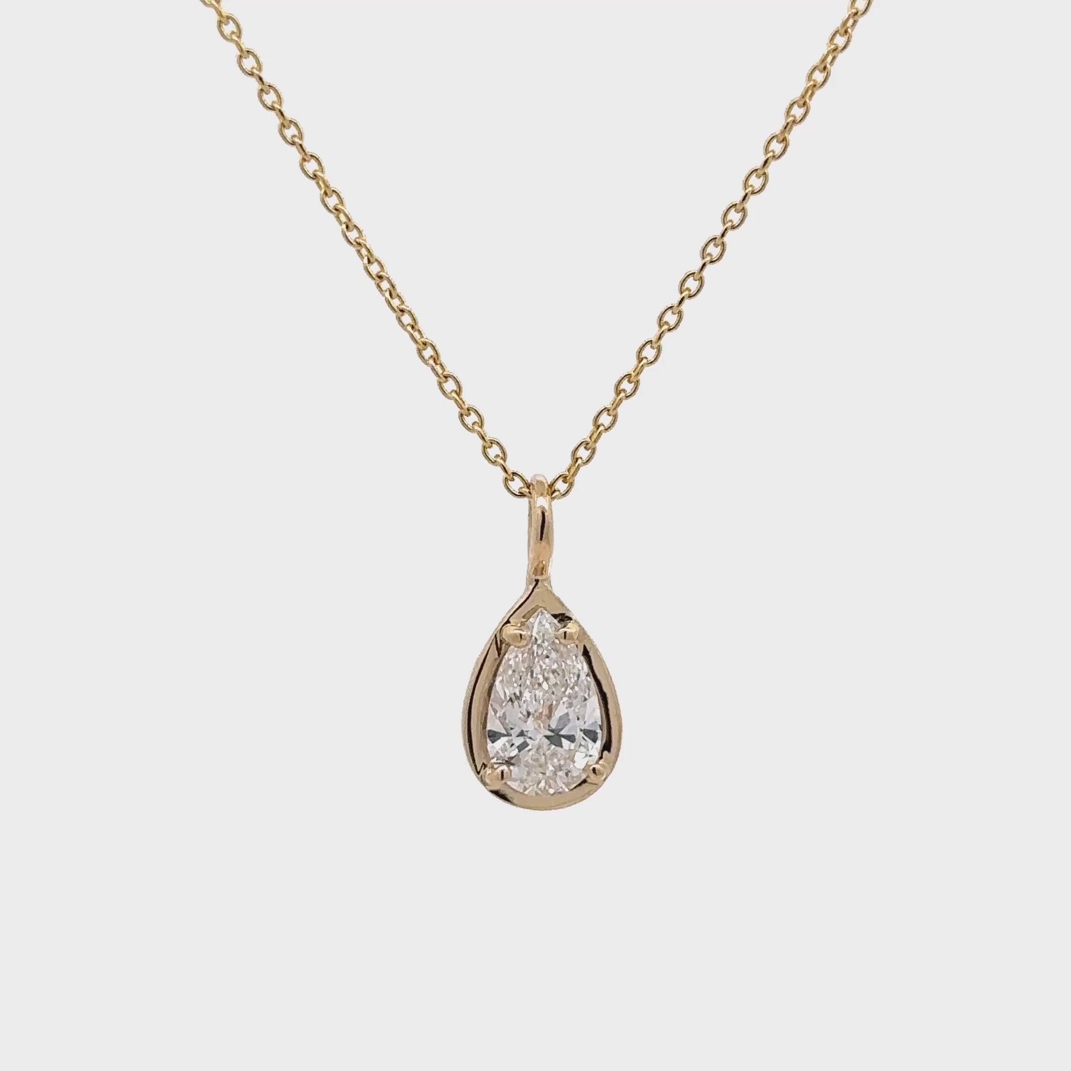 Elevate your style with this stunning Diamond necklace, featuring a brilliant pear-shape lab grown diamond pendant suspended from a lustrous rolo gold chain. The diamond's exceptional cut unleashes remarkable brilliance and fire, making it an exquisite centerpiece. This necklace exudes elegance and sophistication, perfect for adding a touch of luxury to any ensemble.
