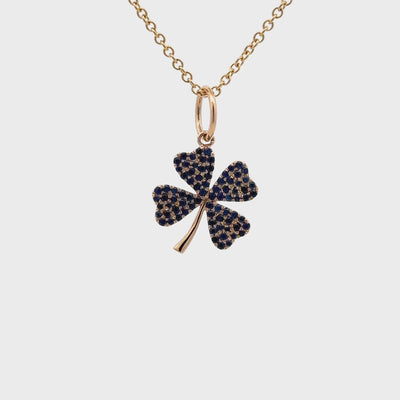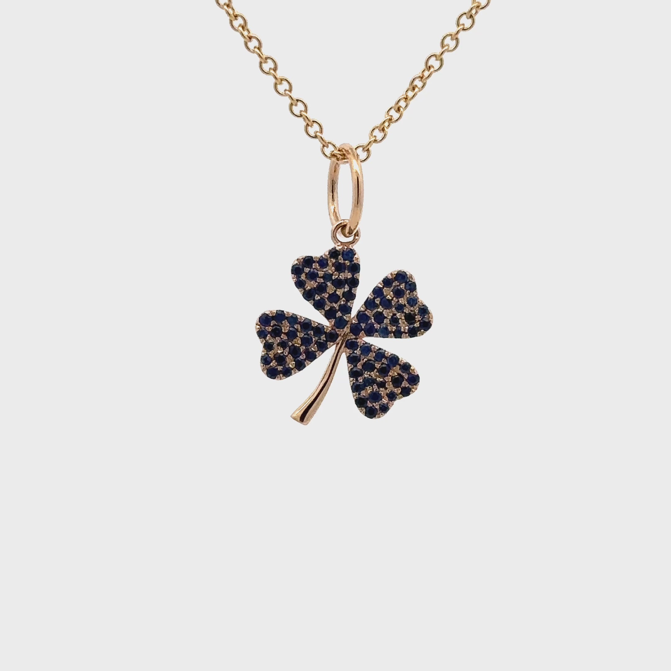The lucky four leaf clover pendant, adorned with Pave blue sapphire gemstones. This piece offers a touch of whimsical elegance. It's a perfect addition to any jewelry collection, offering both beauty and symbolic significance. Shown with optional chain. To choose the chain option click here